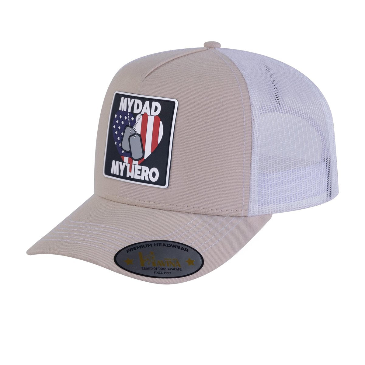 Embroidered My Dad My Hero - 5 Panel Trucker Hat - Beige/White