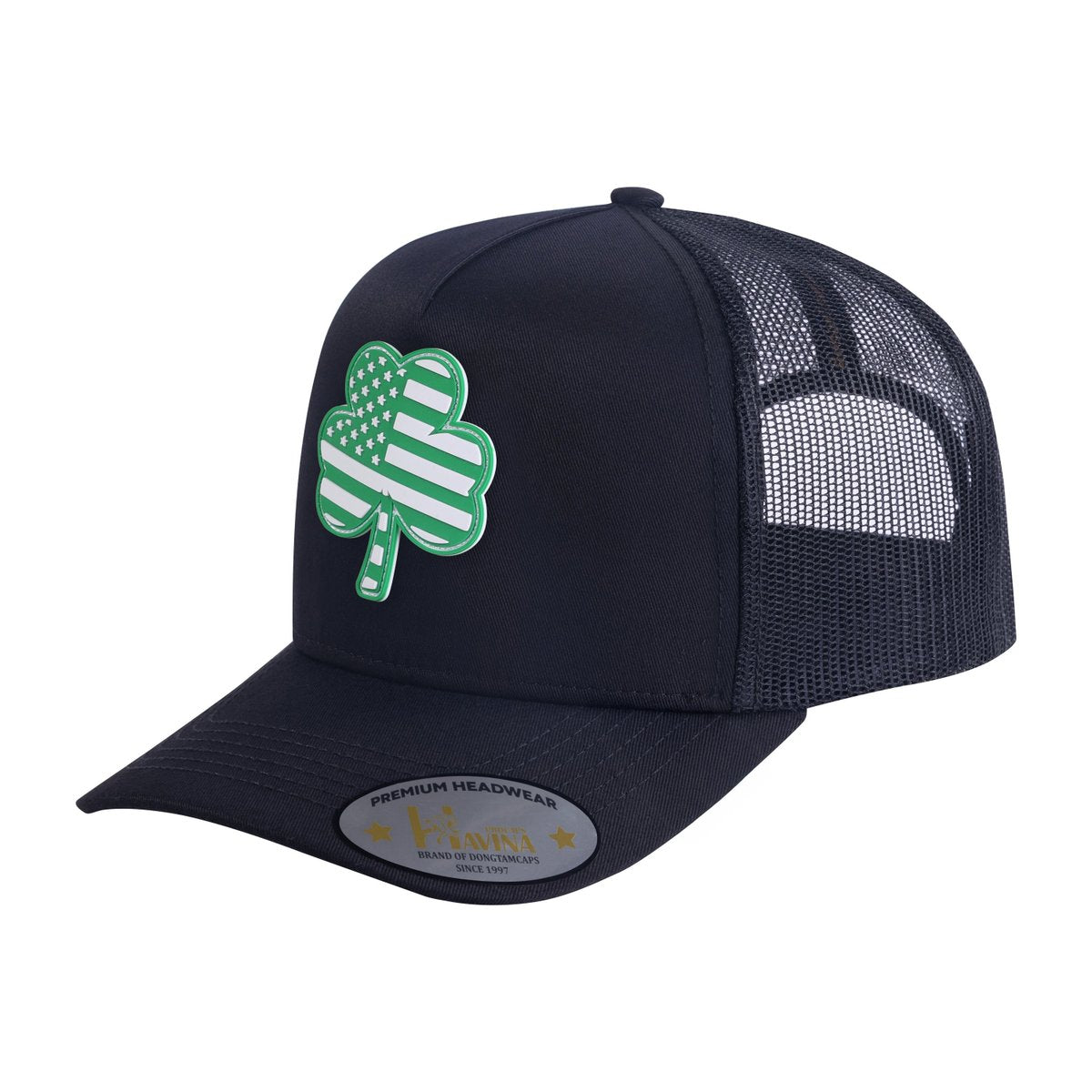 Embroidered St. Patrick'S Day Four Leaf Shamrock - 5 Panel Trucker Hat - Black/Black