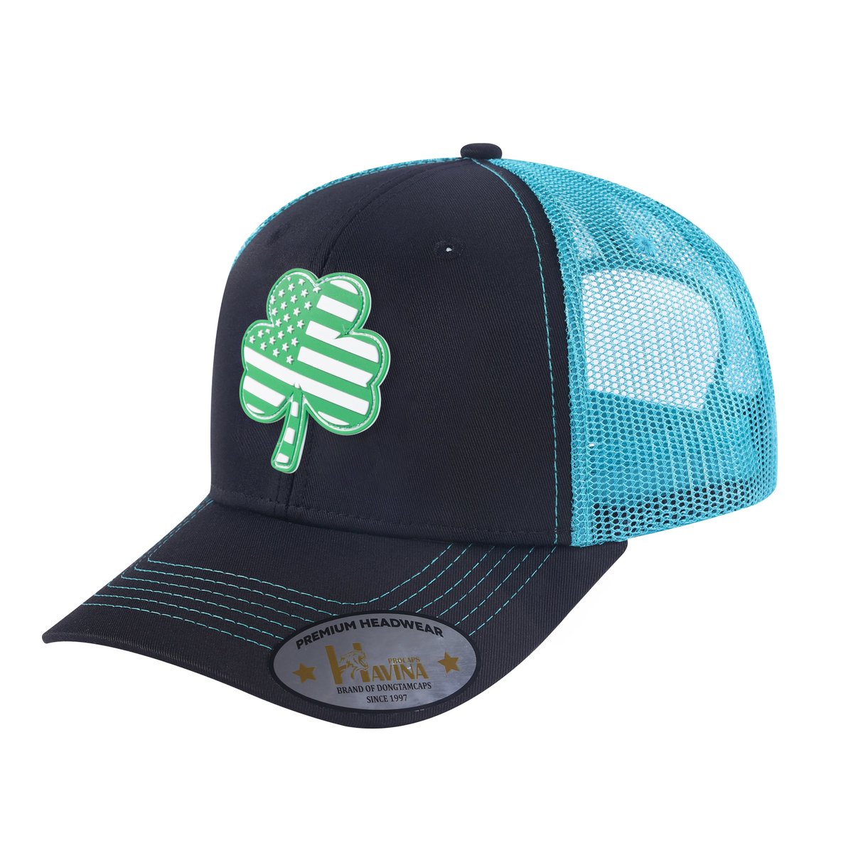 Embroidered St. Patrick'S Day Four Leaf Shamrock - 6 Panel Trucker Hat - Black/Blue