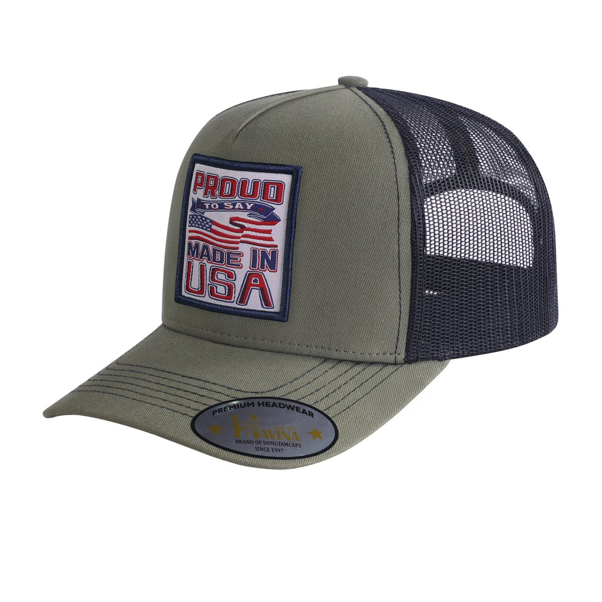 Embroidered Proud To Say Made In US - 5 Panel Trucker Hat - Olive Green/Black