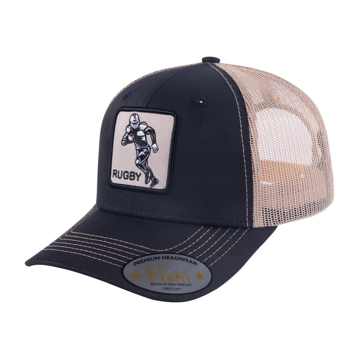 Embroidered Rugby - 6 Panel Trucker Hat - Black/Khaki