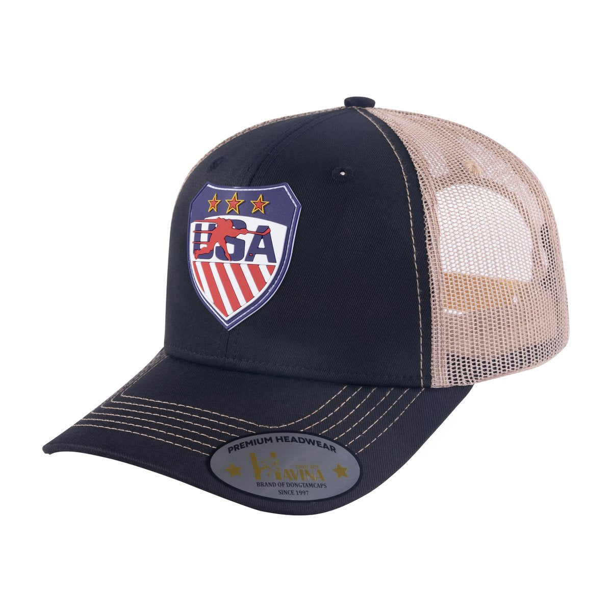 Embroidered US Loving Hockey - 6 Panel Trucker Hat - Black/Khaki