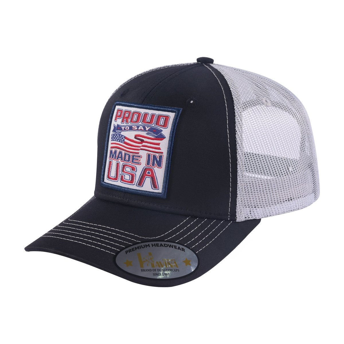 Embroidered Proud To Say Made In US - 6 Panel Trucker Hat - Black/Light Grey