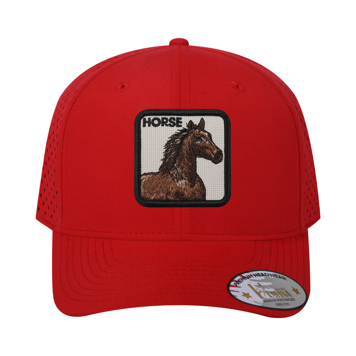 Embroidered The Horse - 6 Panel Microfiber Laser hole Trucker Hat - Red/Red