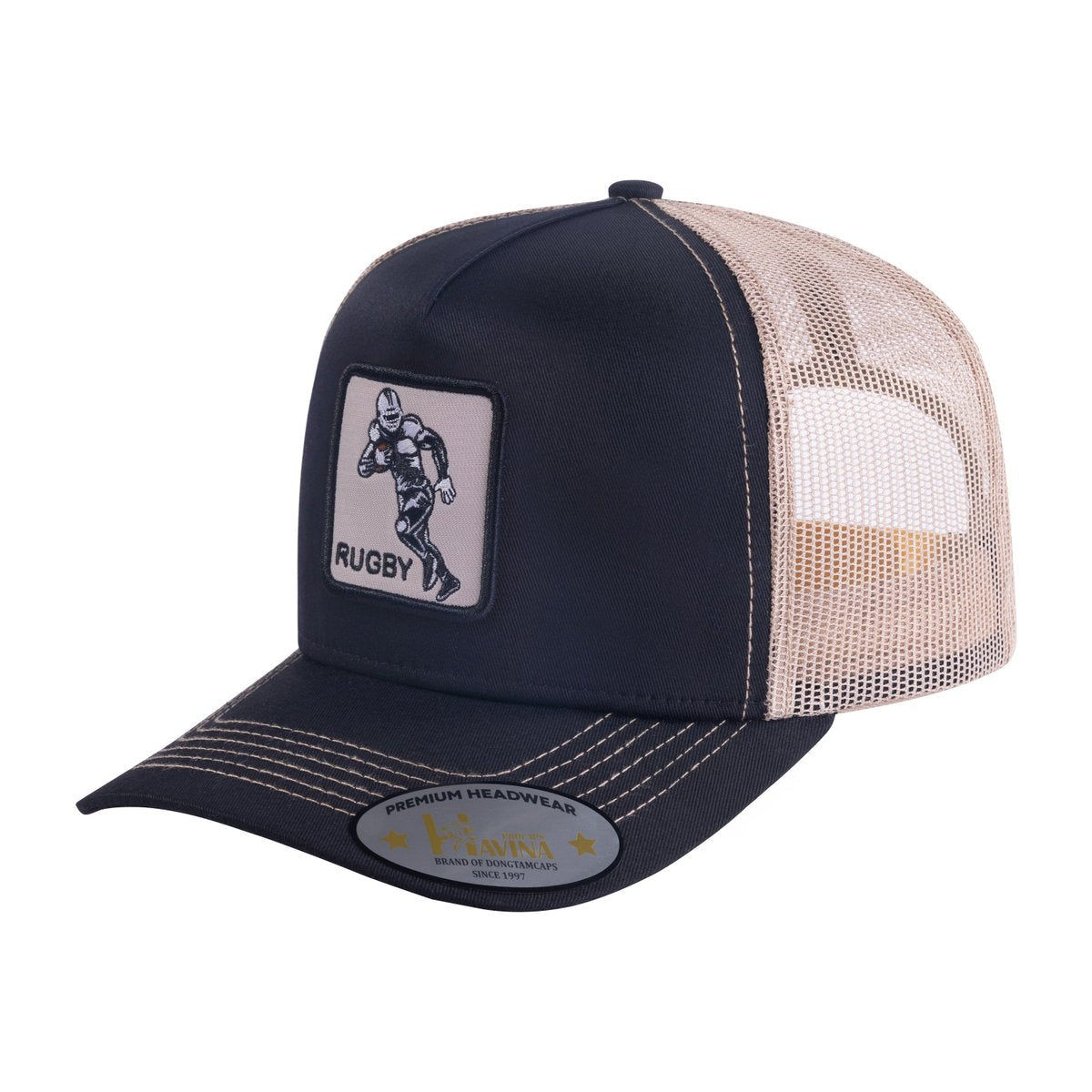 Embroidered Rugby/Football - 5 Panel Trucker Hat - Black/Light Grey