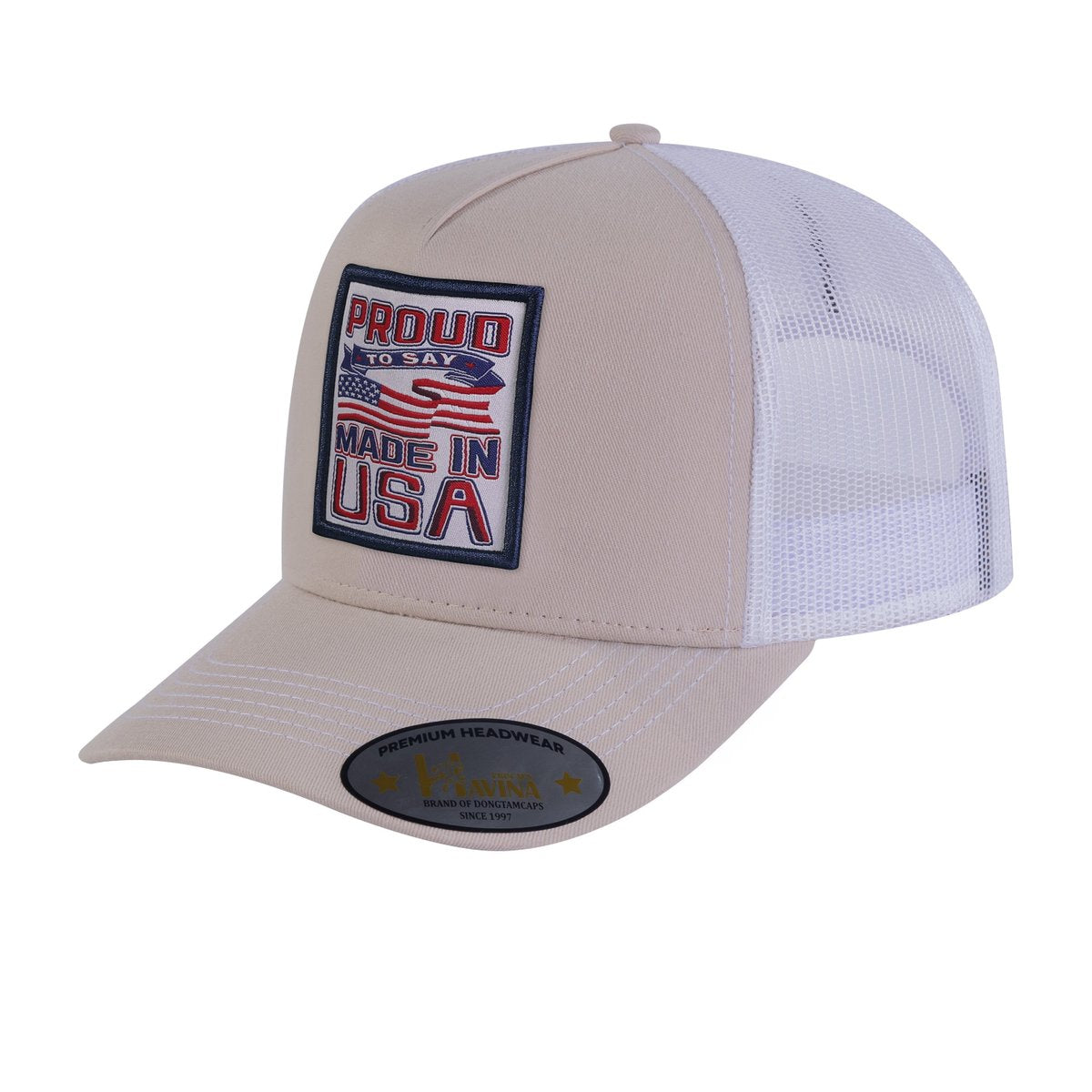 Embroidered Proud To Say Made In US - 5 Panel Trucker Hat - Beige/White