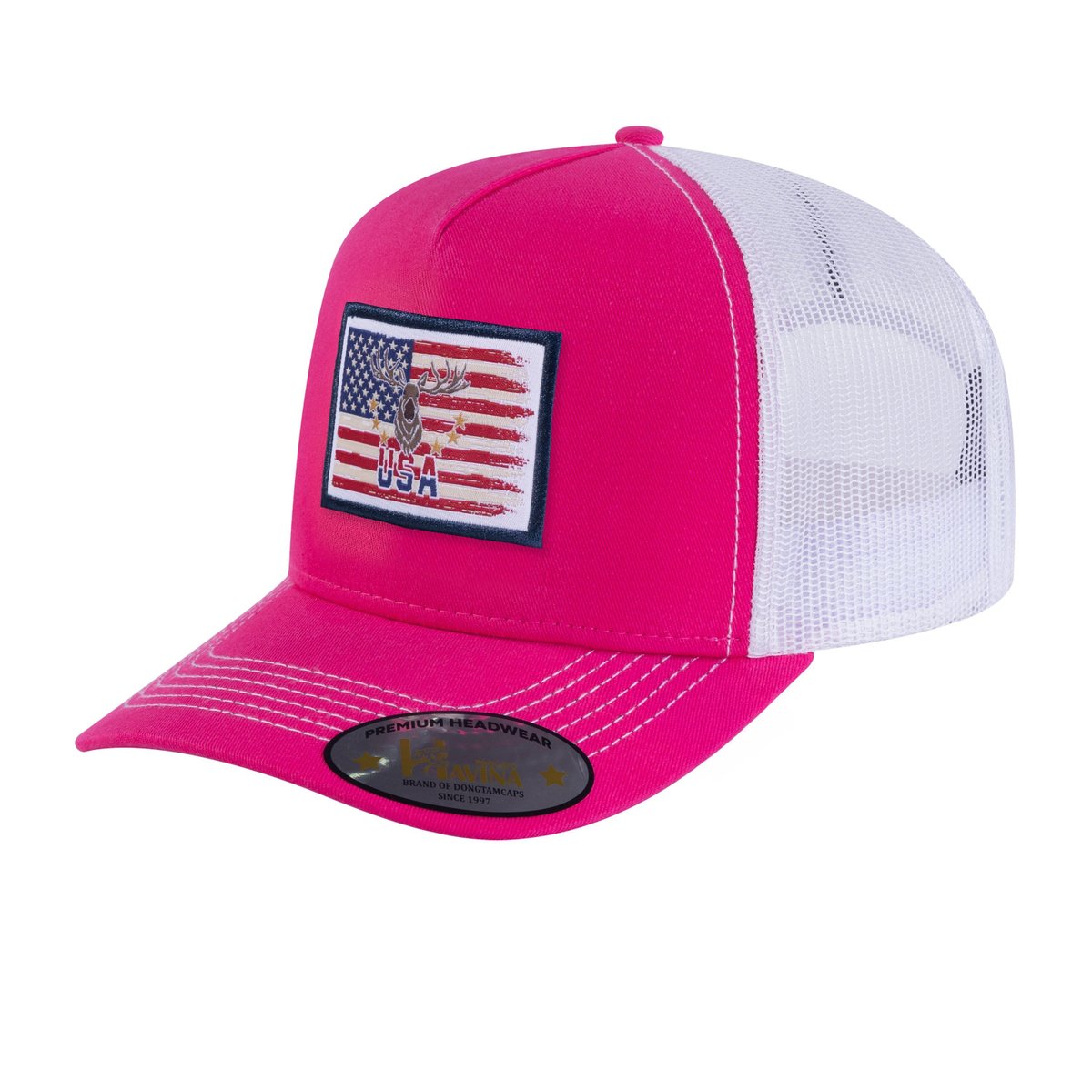 Embroidered US Deer Hunter - 5 Panel Trucker Hat - Pink/White