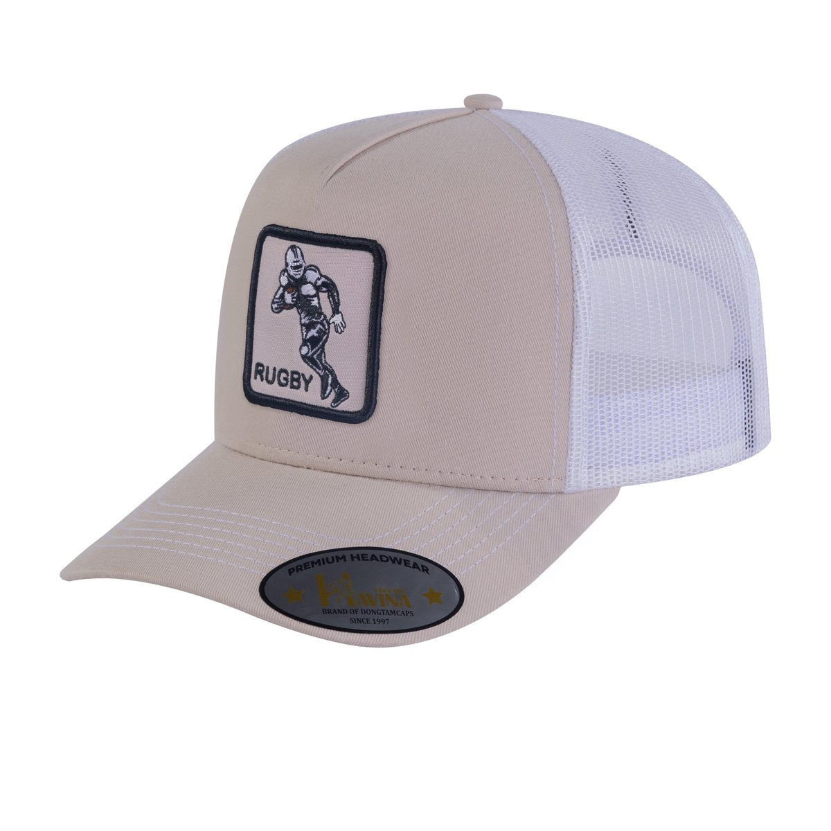 Embroidered Rugby/Football - 5 Panel Trucker Hat - Beige/White
