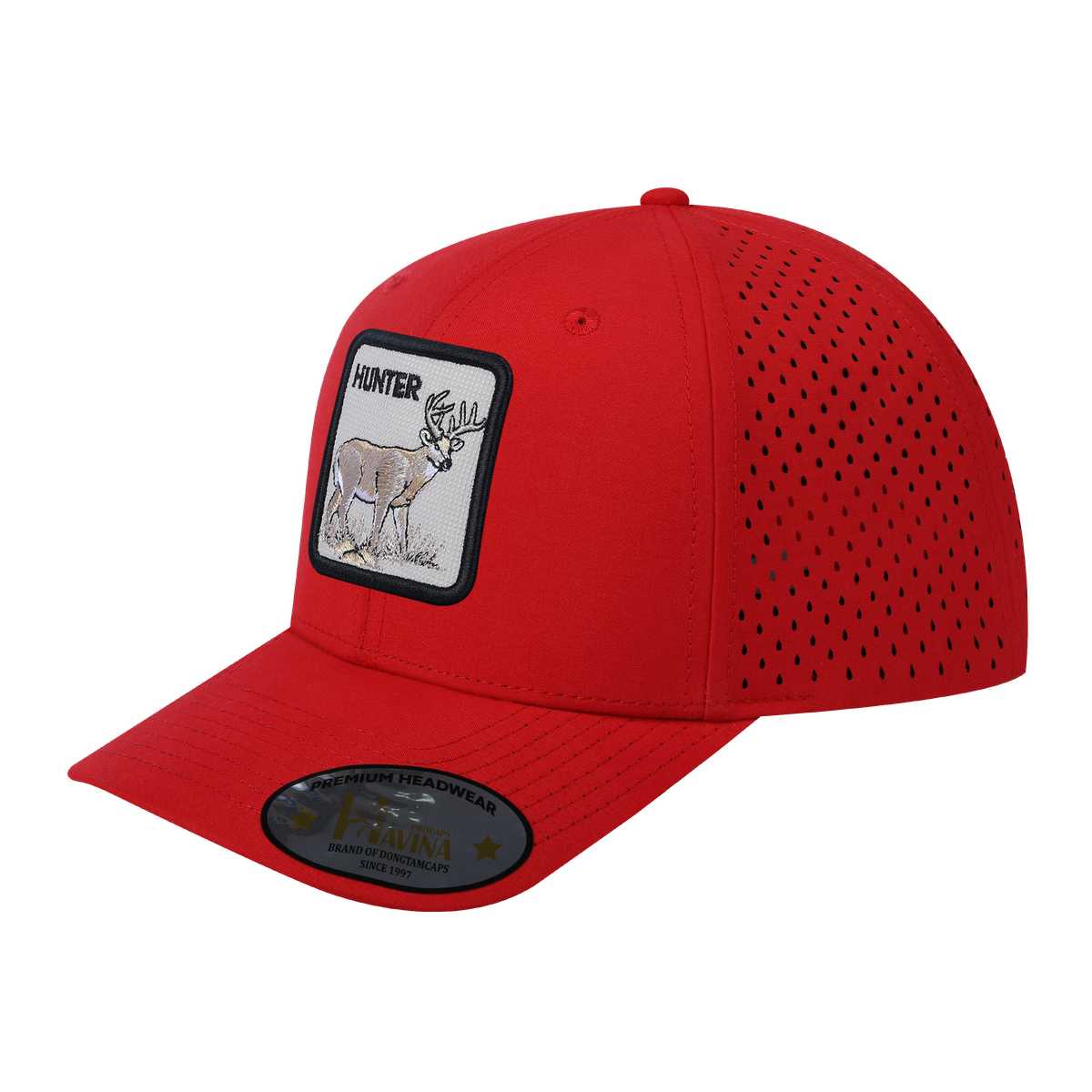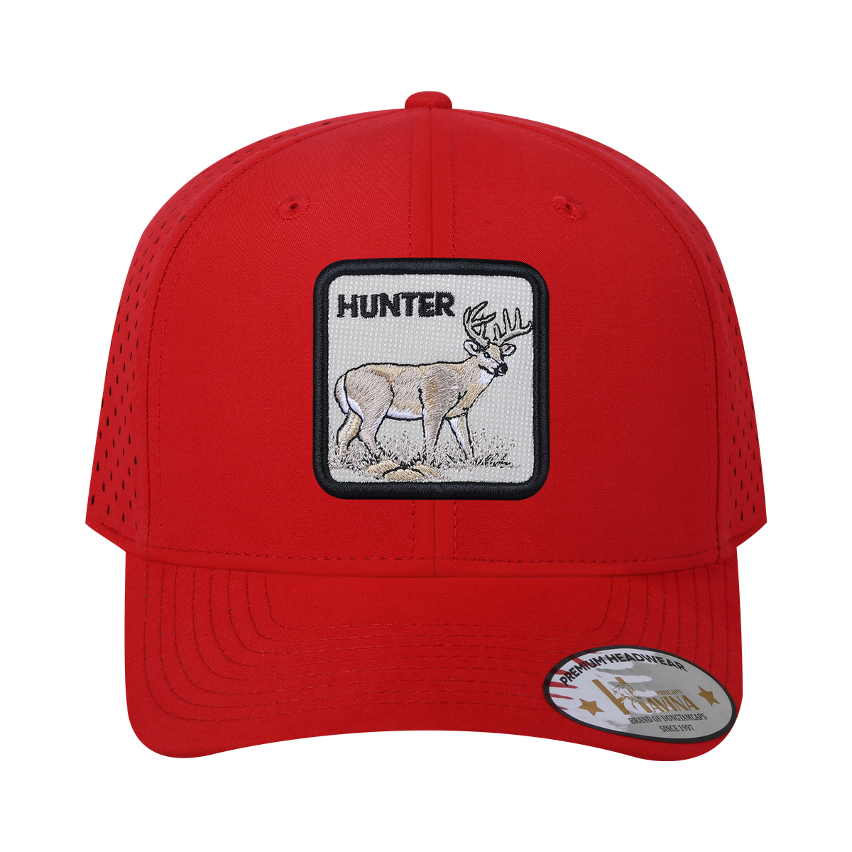 Embroidered The Hunter - 6 Panel Microfiber Laser hole Trucker Hat - Red/Red