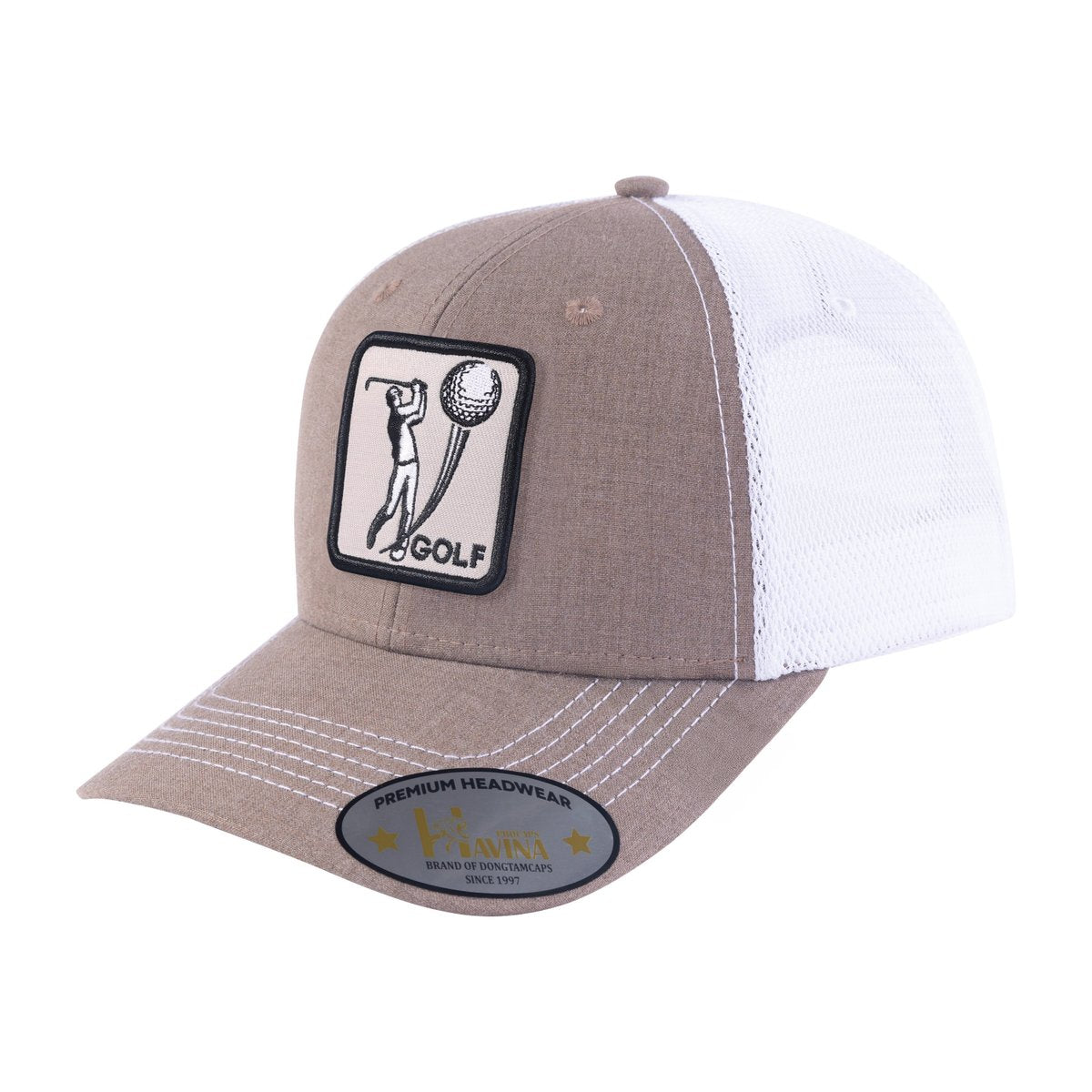 Embroidered Golf - 5 Panel Trucker Hat - Beige/White