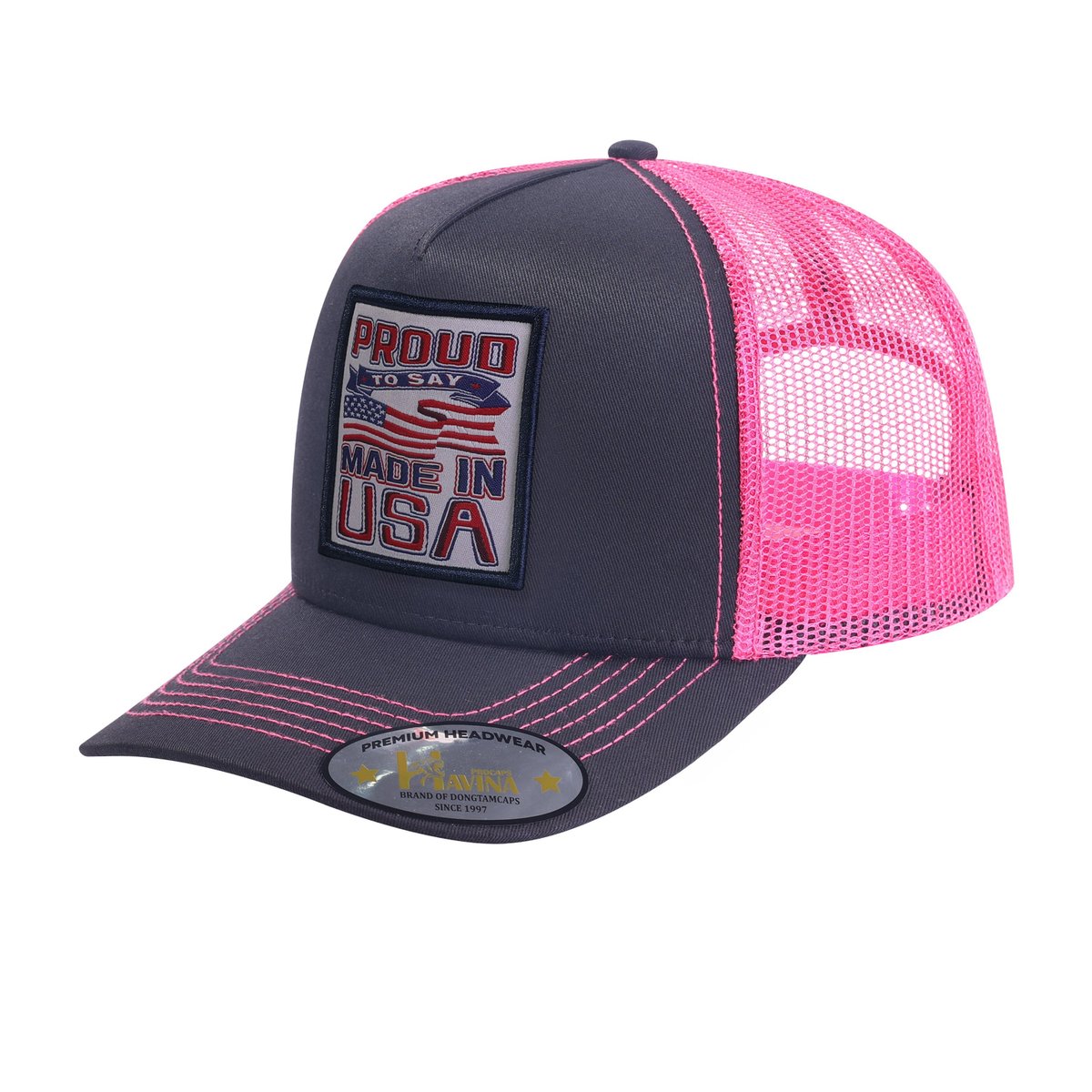 Embroidered Proud To Say Made In US - 5 Panel Trucker Hat - Black/Pink