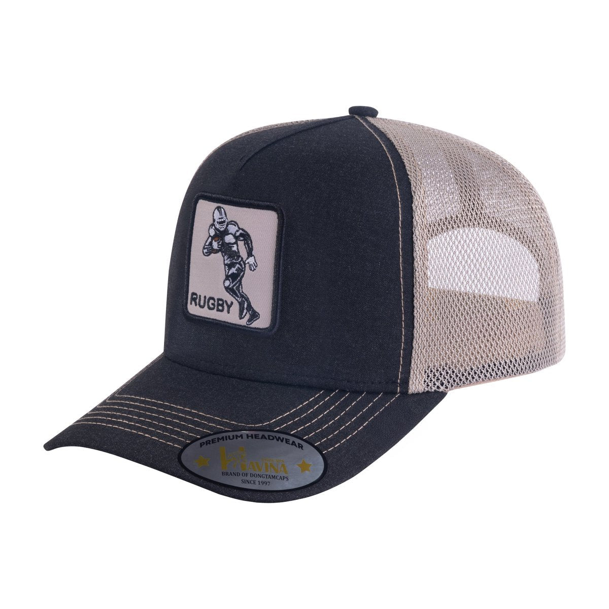 Embroidered Rugby/Football - 5 Panel Trucker Hat - Black/Khaki