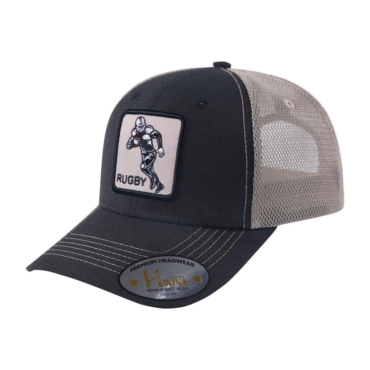 Embroidered Rugby - 6 Panel Trucker Hat - Black/Khaki