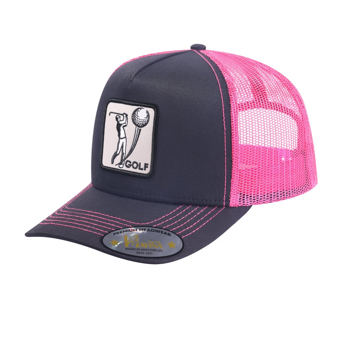 Embroidered Golf - 5 Panel Trucker Hat - Black/Pink