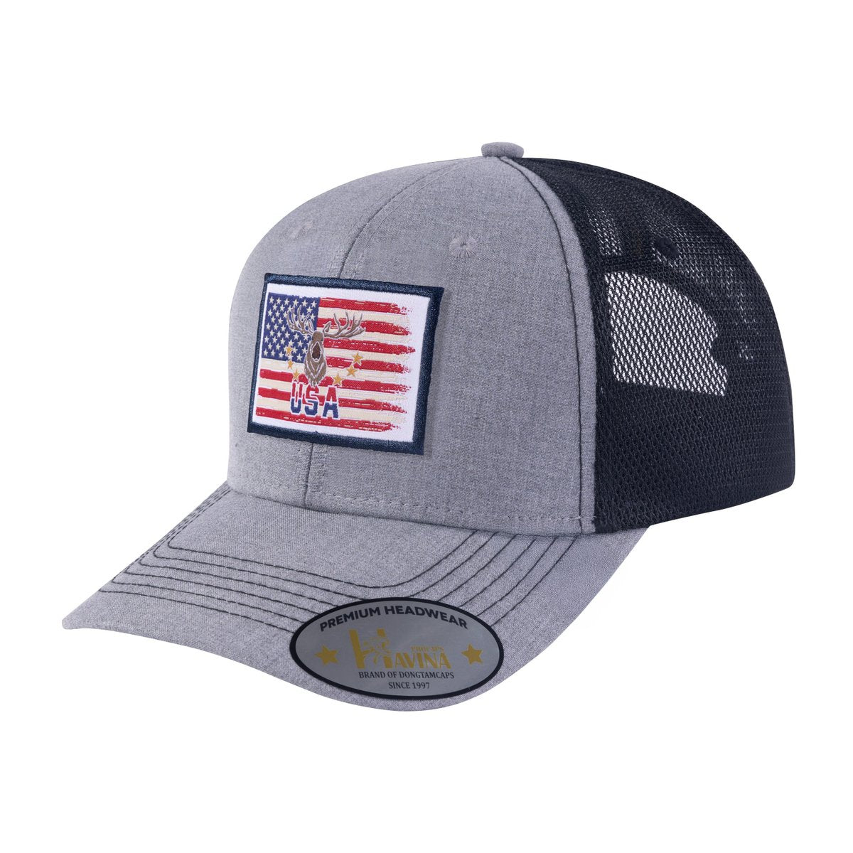 Embroidered Usa Deer Hunter - 6 Panel Trucker Hat - Light Grey/Black
