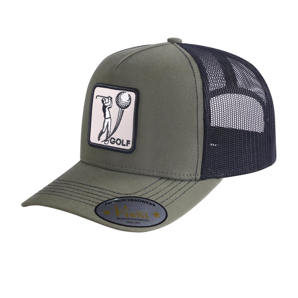 Embroidered Golf - 5 Panel Trucker Hat - Olive Green/Black