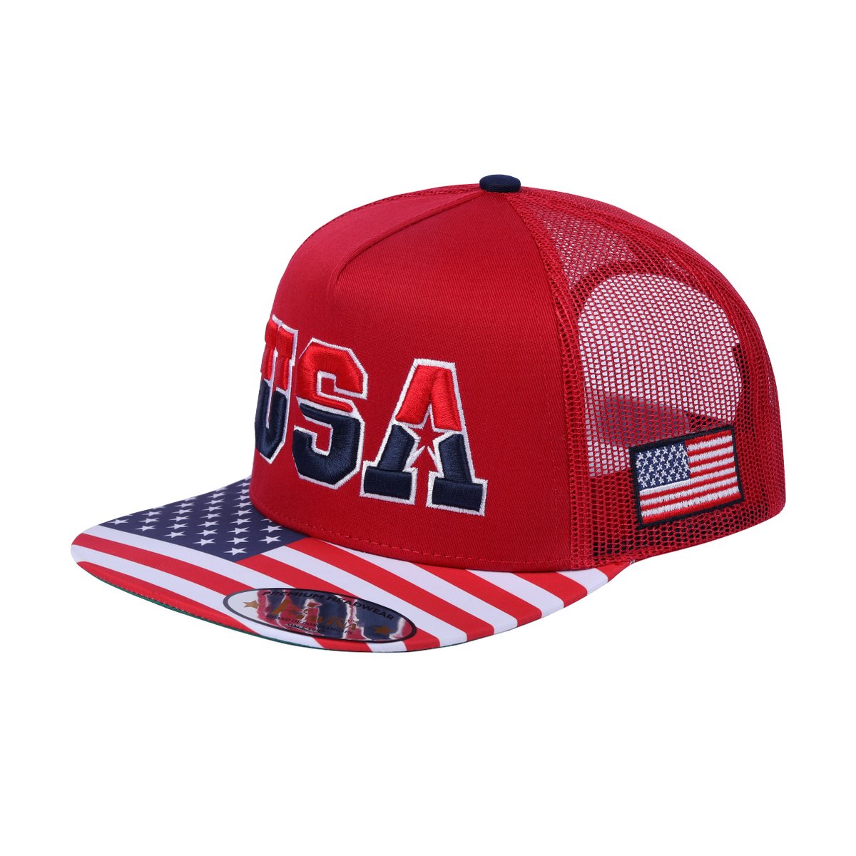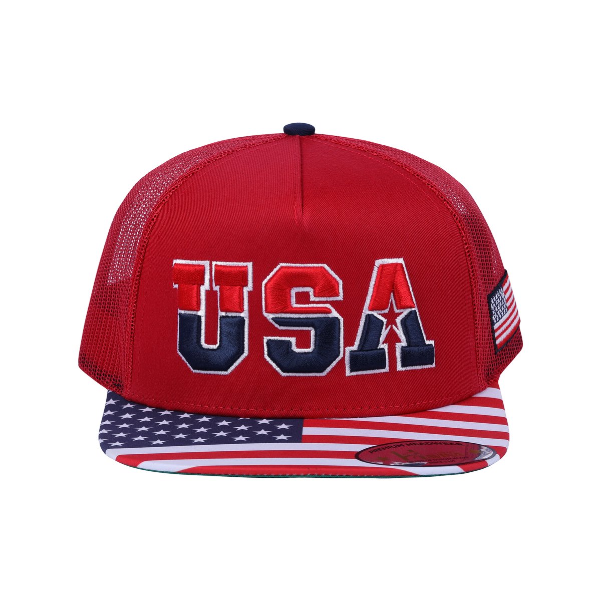 Embroidered Classic US American Flag - 5 Panel Snap Trucker Hat - Red
