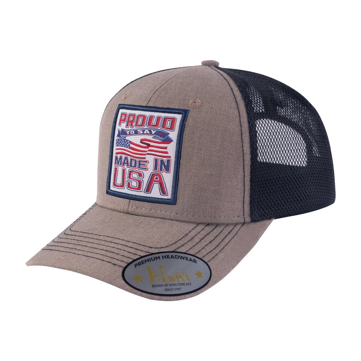 Embroidered Proud To Say Made In US - 6 Panel Trucker Hat - Light Brown/Black