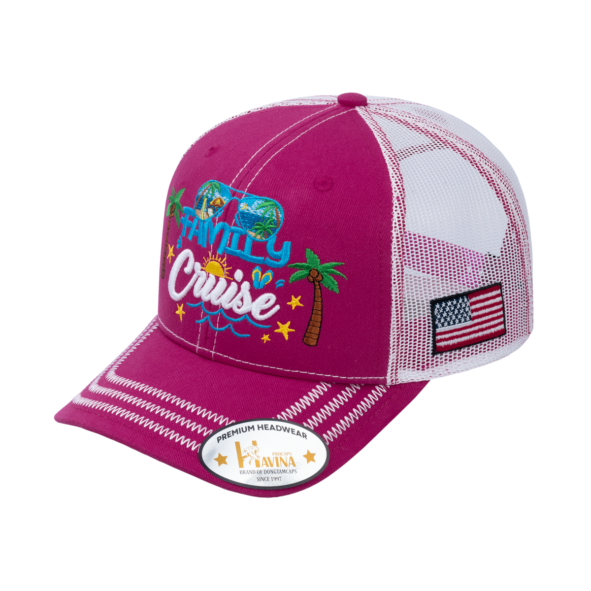 Embroidered Family Cruise - Traveling - 6 Panel Trucker Hat - Pink/White - Zig Zag