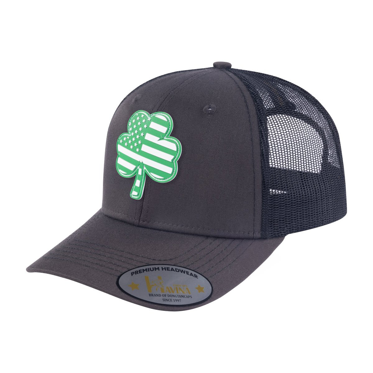 Embroidered St. Patrick'S Day Four Leaf Shamrock - 6 Panel Trucker Hat - Dark Grey/Black