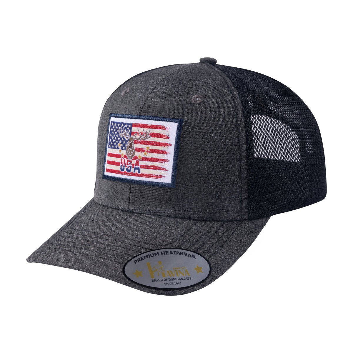 Embroidered Usa Deer Hunter - 6 Panel Trucker Hat - Dark Grey/Black