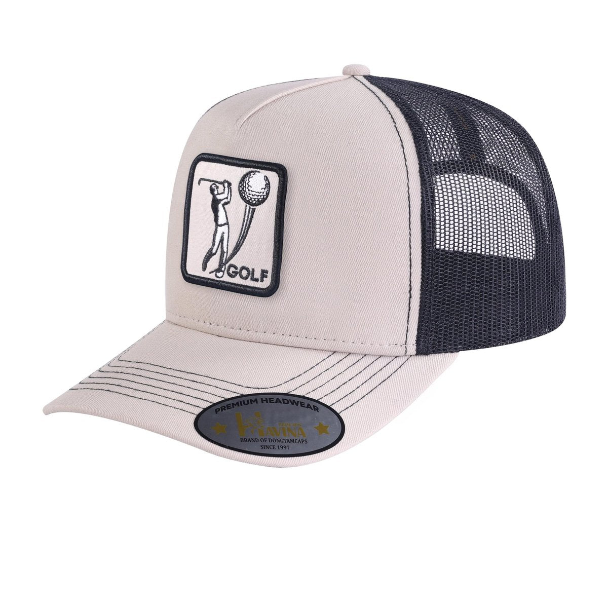 Embroidered Golf - 5 Panel Trucker Hat - Beige/Black