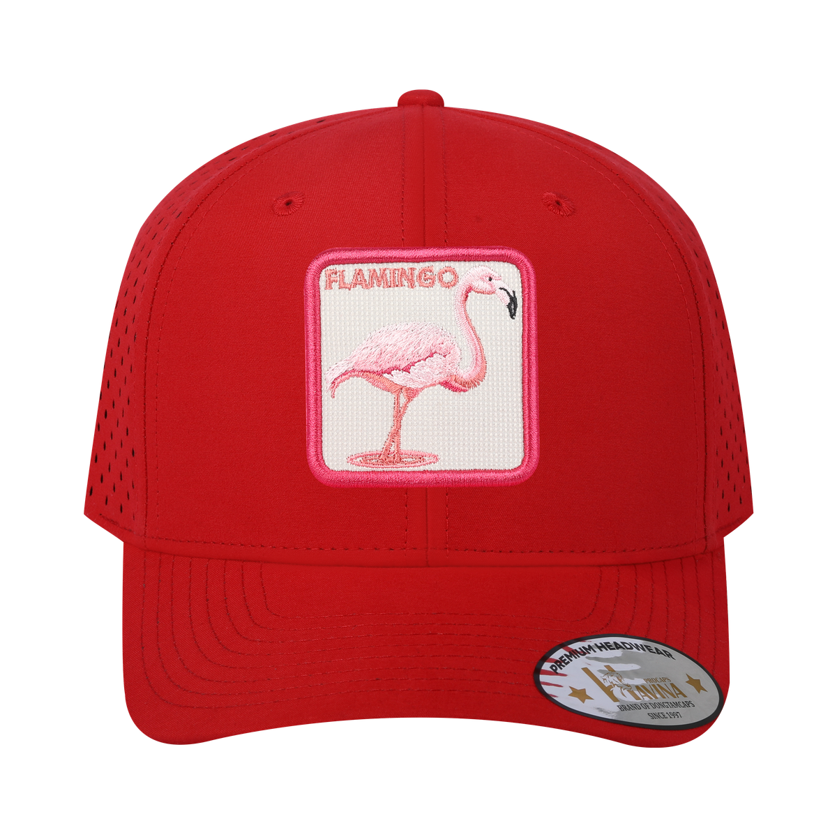 Embroidered The Flamingo - 6 Panel Microfiber Laser hole Trucker Hat - Red/Red