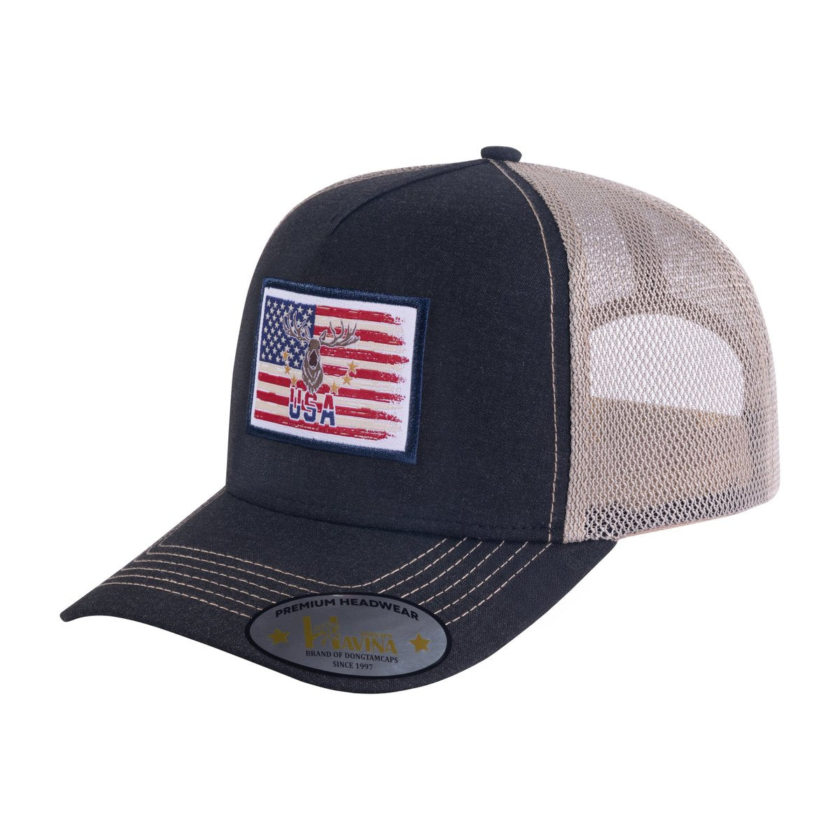 Embroidered US Deer Hunter - 5 Panel Trucker Hat - Black/Light Grey