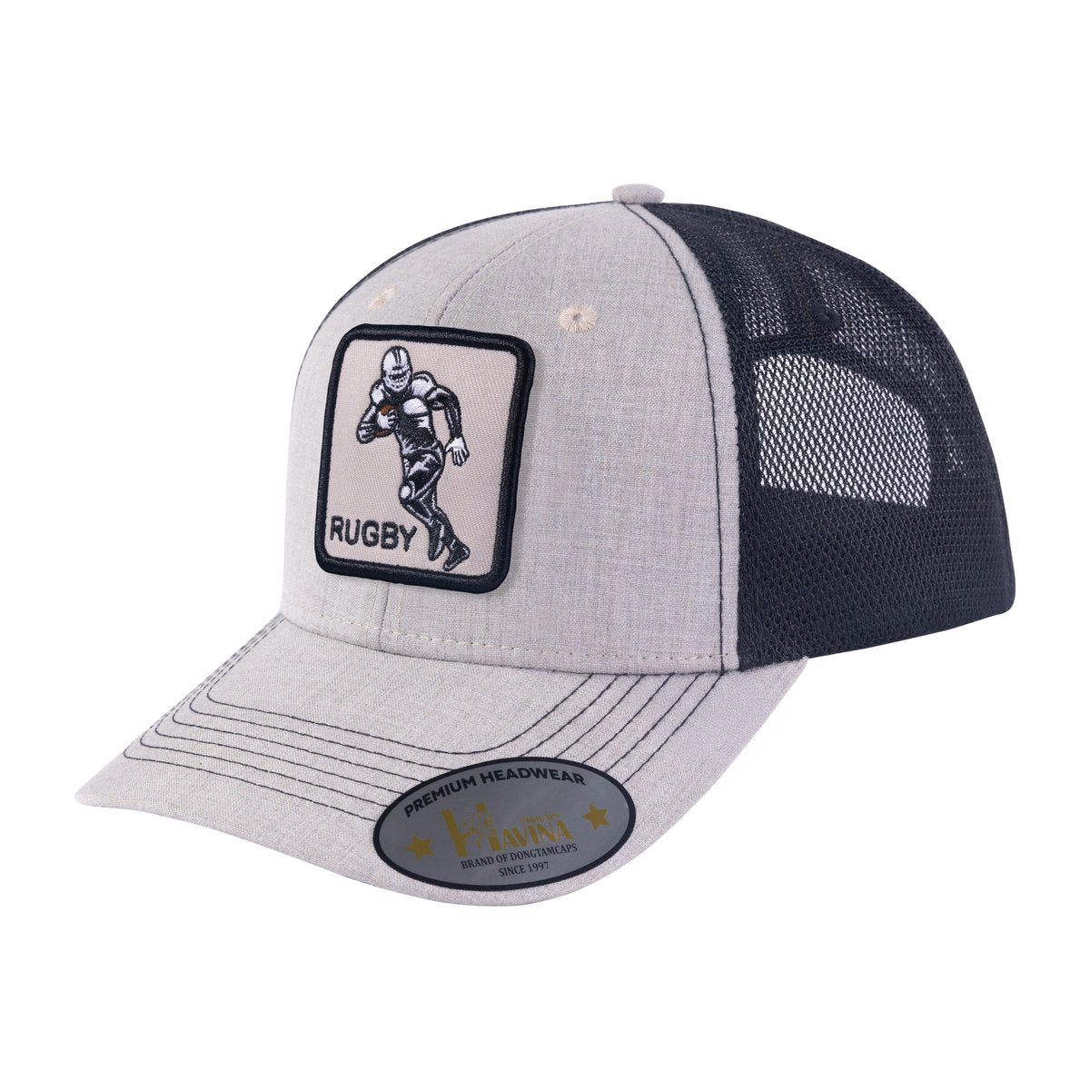 Embroidered Rugby/Football - 6 Panel Trucker Hat - Khaki/Black