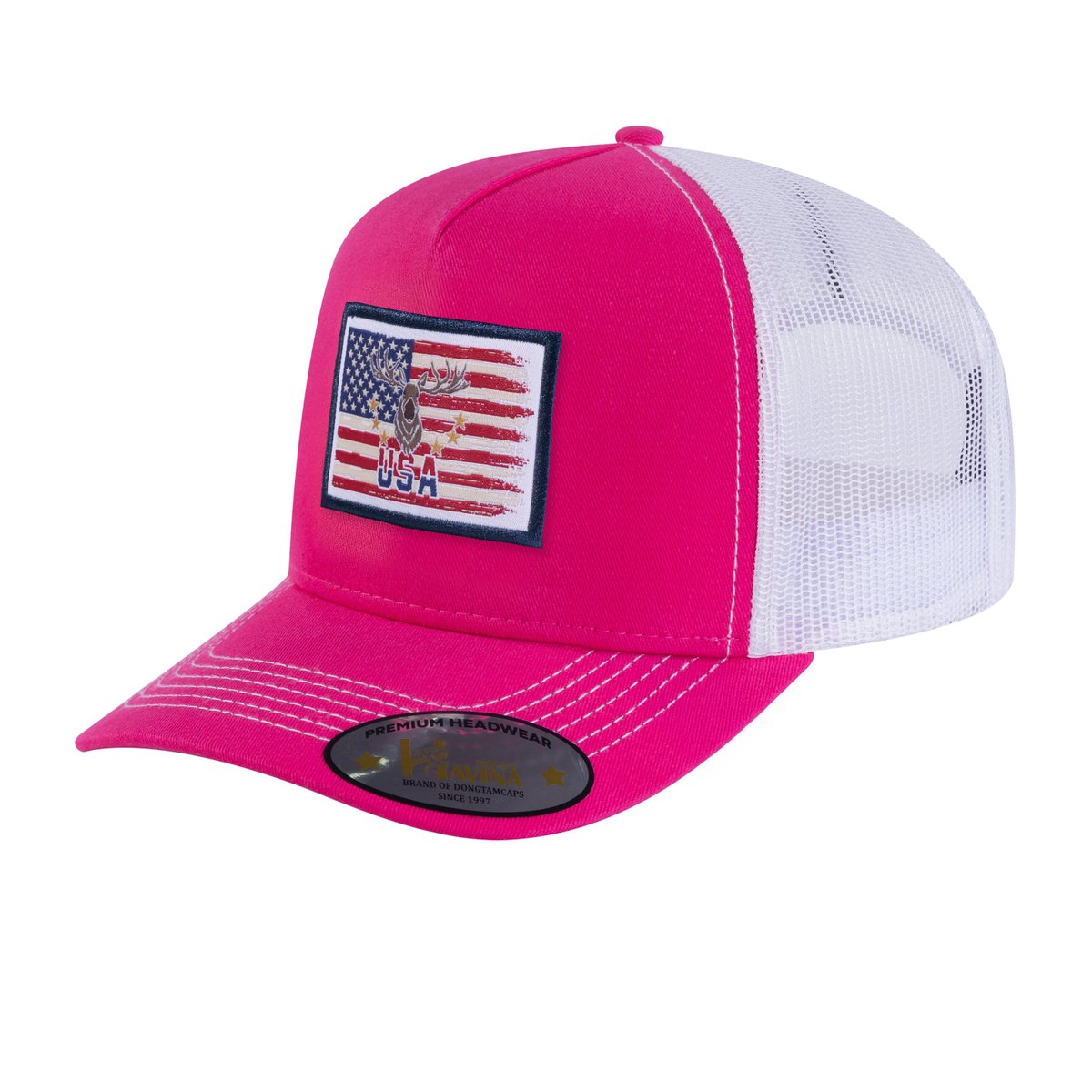 Embroidered Usa Deer Hunter - 5 Panel Trucker Hat - Pink/White